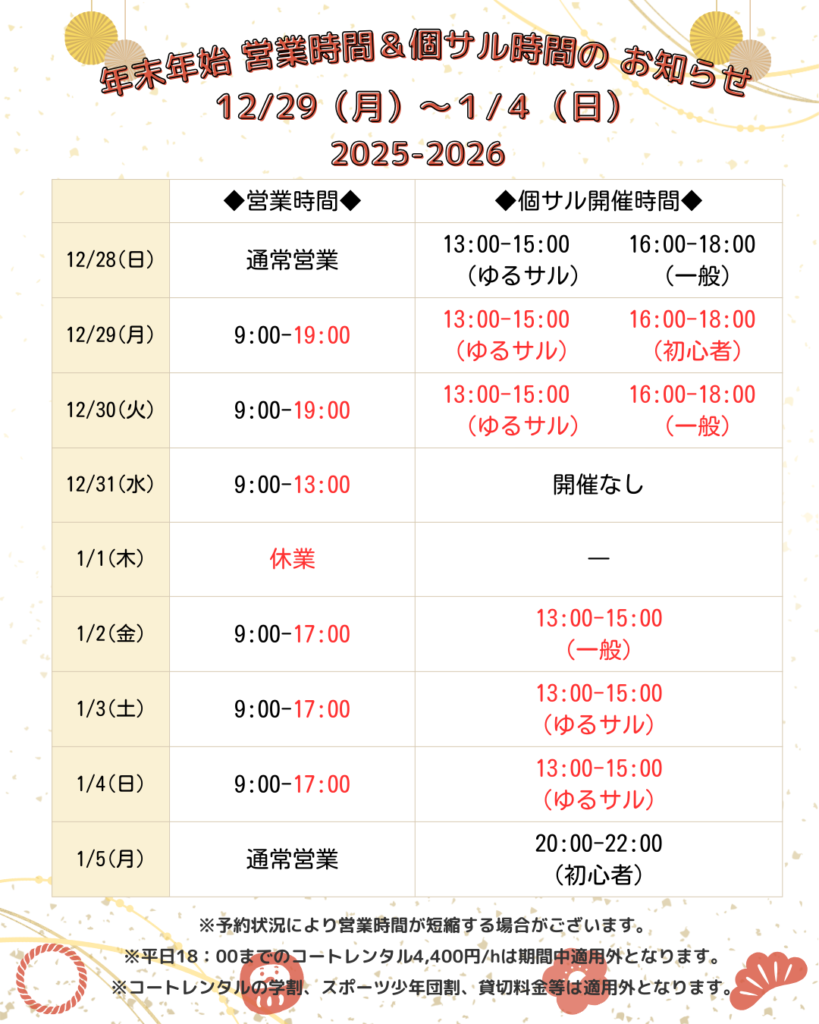 ★年末年始営業時間&個サル時間のお知らせ★ | 群馬県高崎市のフットサルコート キックス高崎